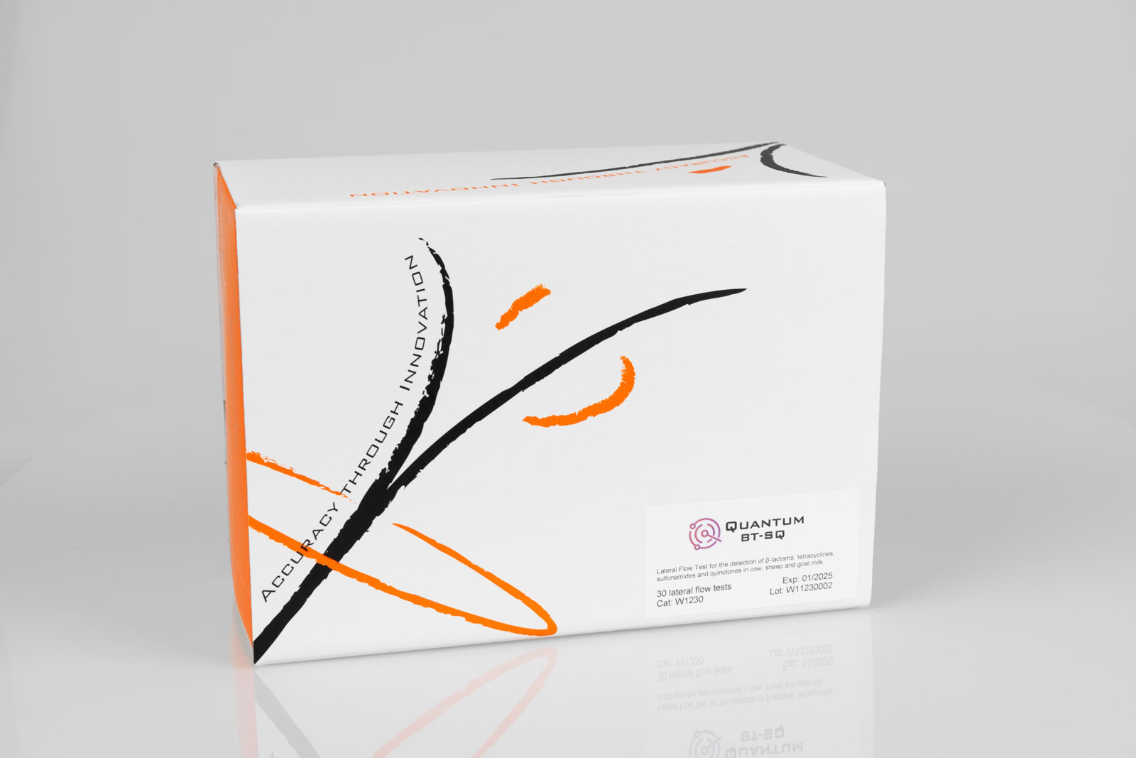 Quantum BT-SQ to ilościowy szybki test przepływu bocznego do jednoczesnego wykrywania czterech rodzin antybiotyków: β-laktamów, tetracyklin, sulfonamidów i chinolonów w surowym mleku krowim, owczym i kozim, a także w mleku pasteryzowanym i mleku w proszku.