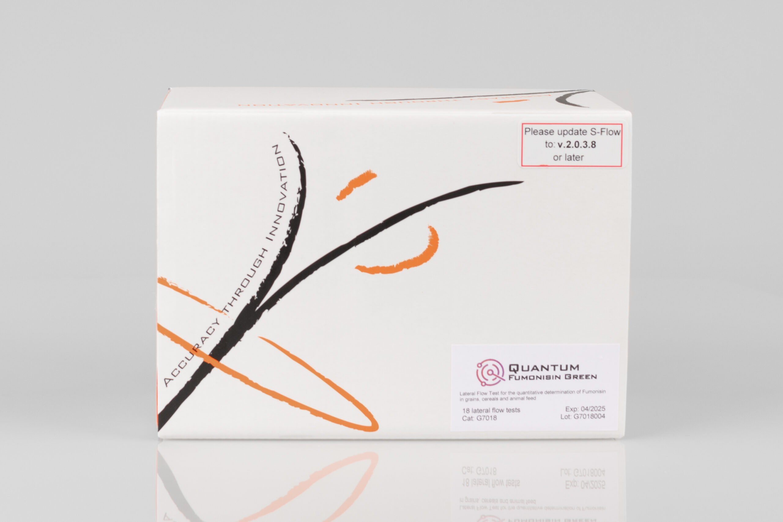 Quantum Fumonisin Green é um dispositivo inovador de fluxo lateral que incorpora tecnologia de ponta para a deteção quantitativa de fumonisina em grãos, cereais e rações para animais. Este teste rápido no formato de cassete utiliza uma solução aquosa na etapa de extração, em vez dos habituais solventes orgânicos.